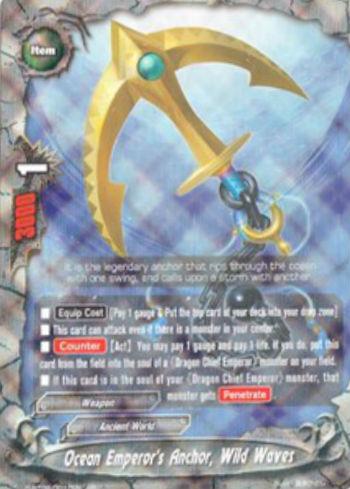 ■ [Equip Cost] [Pay 1 gauge & Put the top card of your deck into your drop zone] ■ This card can attack even if there is a monster in your center. ■ [Counter] [Act] You may pay 1 gauge and pay 1 life. If you do, put this card from the field into the soul of a «Dragon Chief Emperor» monster on your field. ■ If this card is in the soul of your «Dragon Chief Emperor» monster, that monster gets [Penetrate].