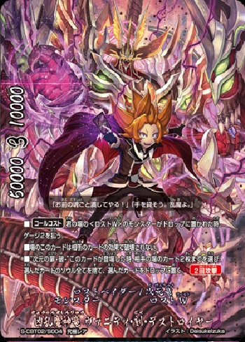 ■ [Call Cost] [When a ‹Lost World› monster is put from the field into your drop zone, Pay 2 gauge] ■ This card on the field cannot be destroyed by your opponent's card effects. ■ "Dimension Door -Impetus-" When this card enters the field, choose up to two cards on your opponent's field, put all soul from them into the drop zone, and put them into the drop zone. [Double Attack]